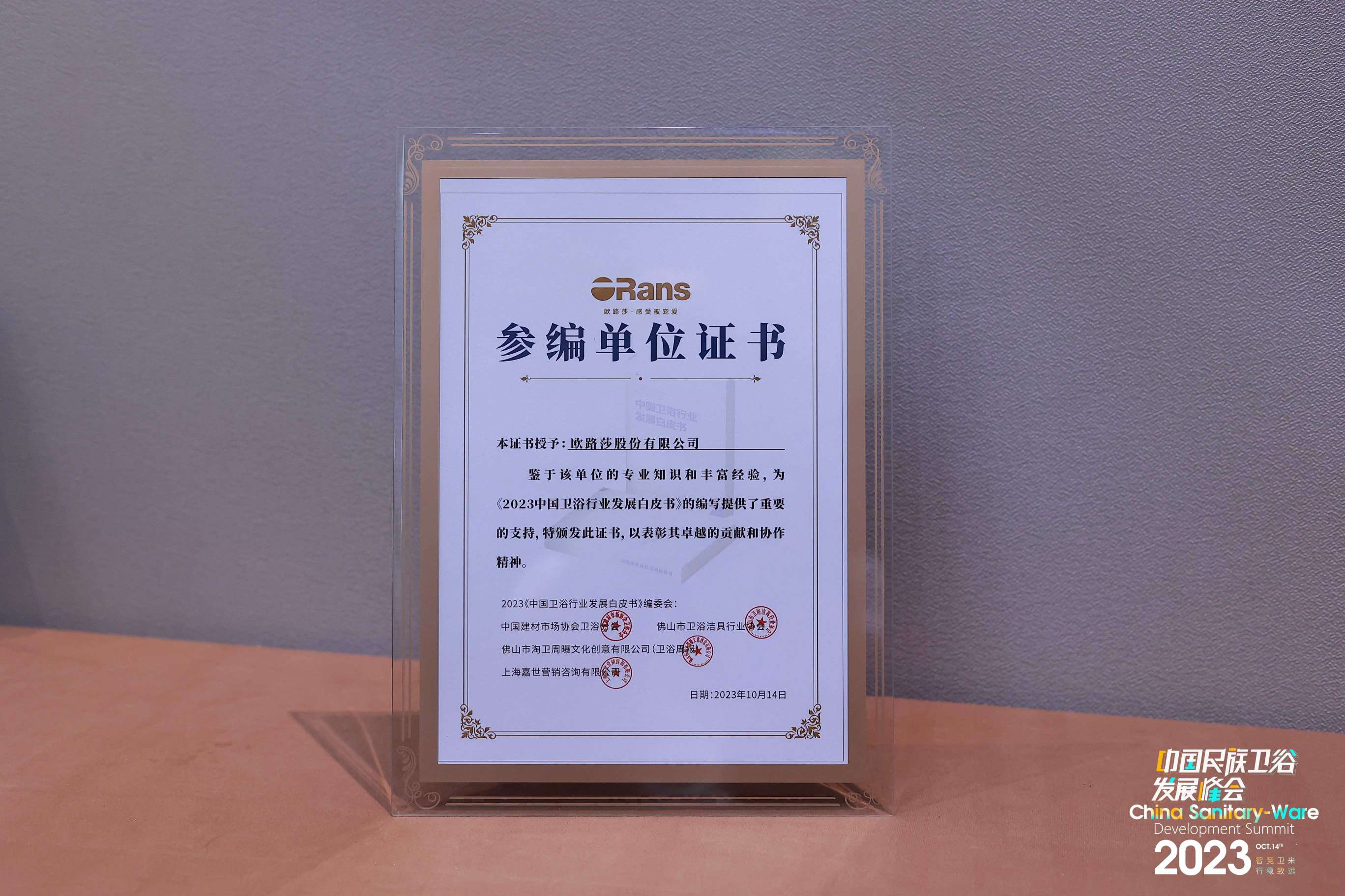 歐路莎衛浴再次榮登“中國衛浴品牌榮光榜”,奪得“衛浴設計領軍品牌”,并為編寫《2023 中國衛浴行業發展白皮書》提供重要支持,獲頒“參編單位證書”。